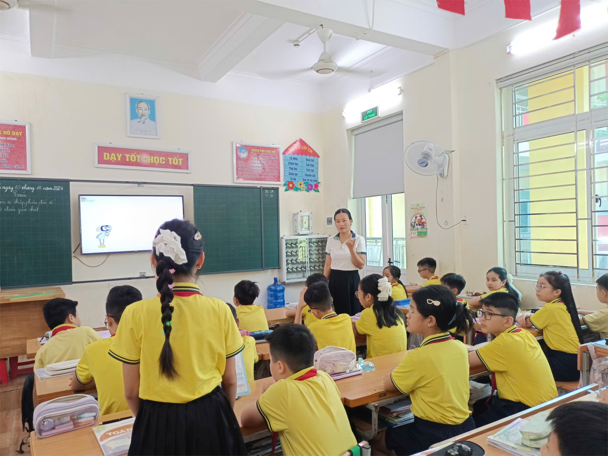 Học sinh lớp 5H2 thể hiện sự chủ động, tích cực trong học tập, đặc biệt là trong phần thảo luận nhóm và trình bày cách suy luận để xác định số tự nhiên gần nhất của một số thập phân. Giáo viên chú trọng đặt câu hỏi mở, khuyến khích học sinh đưa ra nhiều cách nghĩ khác nhau, giúp các em rèn luyện tư duy chính xác và linh hoạt đồng thời phát triển năng lực giải thích và phản biện.