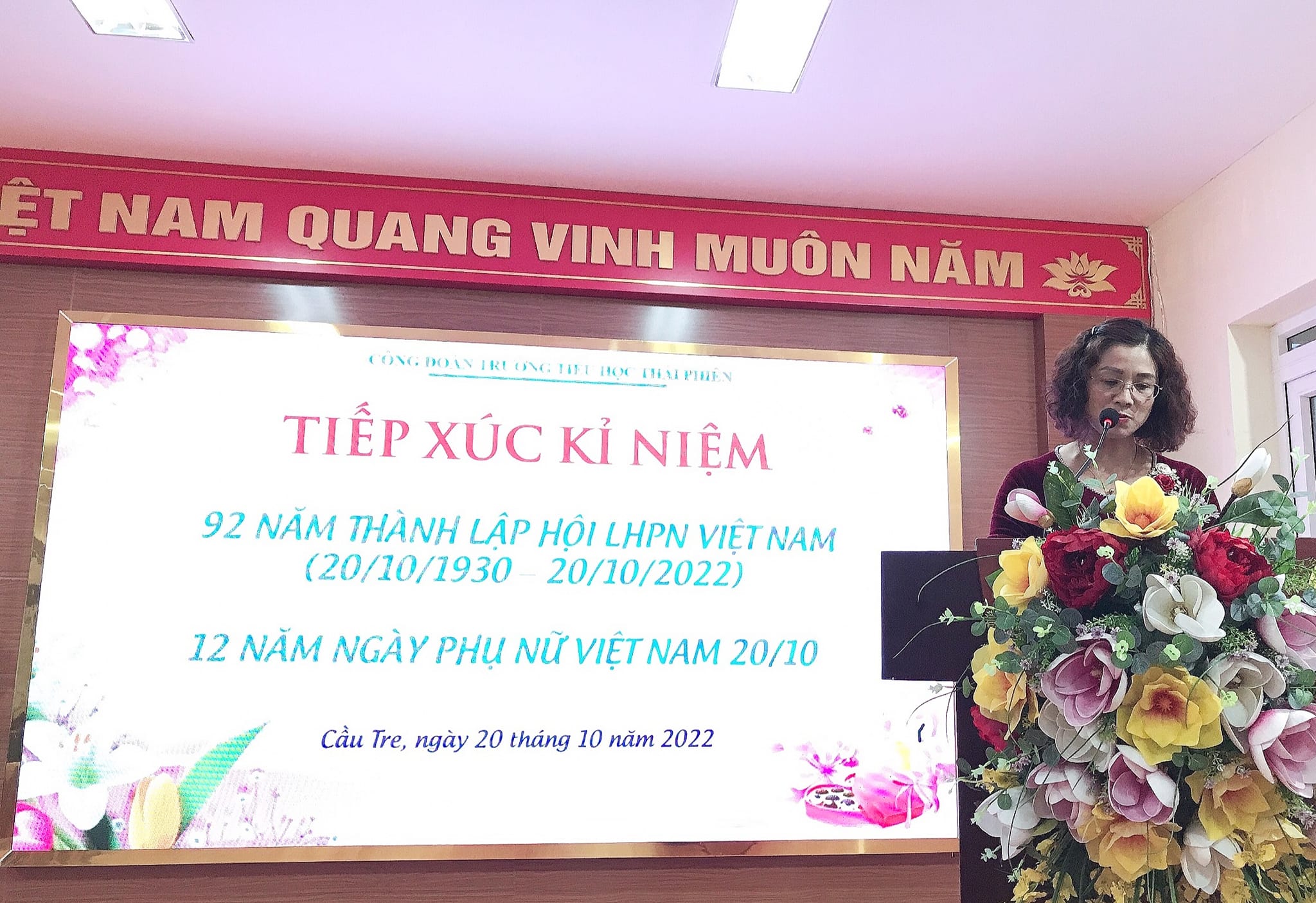 Để tôn vinh một nửa thế giới - những người phụ nữ Việt Nam tận tụy, nhiệt tình, đầy trách nhiệm, hăng say trong công việc, nhân dịp kỉ niệm 92 năm ngày thành lập Hội LHPN Việt Nam và 12 năm ngày Phụ nữ Việt Nam 20/10, công đoàn trường Tiểu học Thái Phiên đã tổ chức tiếp xúc kỉ niệm ngày 20 - 10 giữa các cán bộ giáo viên và nhân viên nhà trường đầy ý nghĩa. Đó là những nữ cán bộ giáo viên, nhân viên “giỏi việc trường, đảm việc nhà”, hết mình phấn đấu rèn luyện, học tập, cống hiến tài năng, trí tuệ, tâm huyết, tận tụy, yêu nghề đóng góp thật nhiều cho sự phát triển của nhà trường như ngày hôm nay.