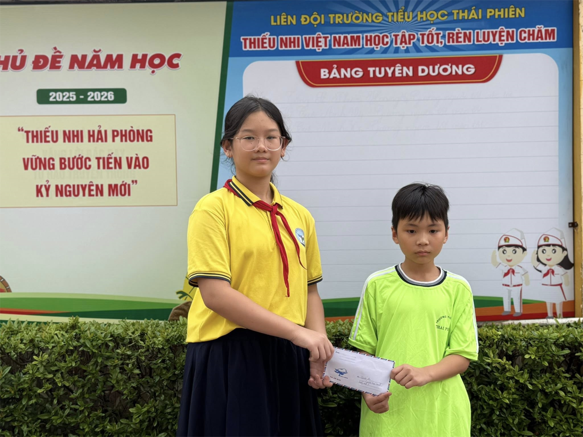 Sáng ngày 18/9/2025 khi đang chơi với các bạn ở sân trường bạn Bảo Trâm lớp 5H2 nhặt được một chiếc phong bì bên trong có 135.000đ. Sau khi nhặt được bạn đã nhờ cô giáo Tổng phụ trách Đội thông báo tìm người đánh rơi là bạn Quốc An lớp 4D5 để trả lại.