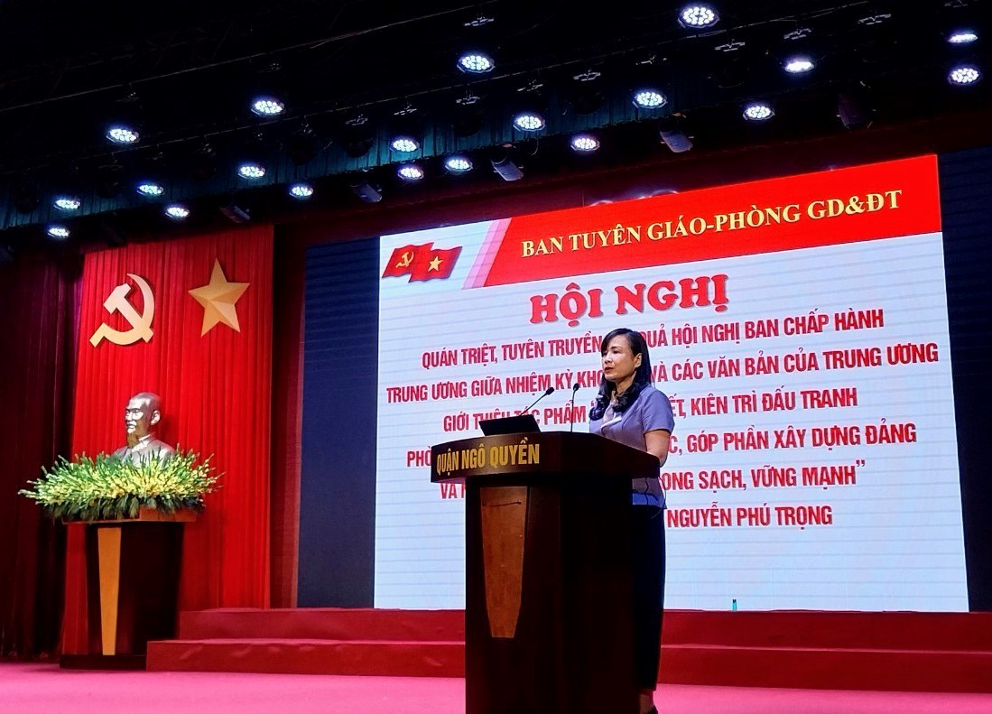 Phát biểu khai mạc chương trình, đồng chí Trịnh Quang Trường, Phó Bí thư Thường trực Quận ủy – Chủ tịch HĐND quận Ngô Quyền nêu rõ, công tác bồi dưỡng chính trị, giúp cho đội ngũ cán bộ lãnh đạo quản lý và giáo viên nắm vững những nội dung cơ bản, những quan điểm mới của Đảng trong các Nghị quyết, Quy định của Đảng thời gian qua, nhất là những nội dung cơ bản về kết quả Hội nghị giữa nhiệm kỳ Ban Chấp hành Trung ương Đảng khóa XIII; Tác phẩm “Kiên quyết, kiên trì đấu tranh phòng, chống tham nhũng, tiêu cực, góp phần xây dựng Đảng và Nhà nước ta ngày càng trong sạch, vững mạnh” của đồng chí Tổng Bí thư Nguyễn Phú Trọng; Quy định số 85-QĐ/TW ngày 07/10/2022 của Ban Bí thư về việc cán bộ, đảng viên thiết lập và sử dụng các trang thông tin điện tử cá nhân trên internet và mạng xã hội; Quy định số 99-QĐ/TW ngày 27/02/2023 của Ban Bí thư về cờ Đảng Cộng sản Việt Nam và việc sử dụng cờ Đảng; những vấn đề mới cần quan tâm trong đời sống chính trị - kinh tế - xã hội của đất nước, thành phố, quận Ngô Quyền và ngành giáo dục cũng như các vấn đề chuyên môn nghiêp vụ theo kế hoạch, nhiệm vụ năm học 2023 - 2024. Góp phần nâng cao trách nhiệm, bản lĩnh chính trị, niềm tin và chuẩn mực đạo đức nhà giáo, hoàn thành tốt mục tiêu, nhiệm vụ trong năm học mới, đáp ứng yêu cầu đổi mới căn bản, toàn diện giáo dục và đào tạo.
