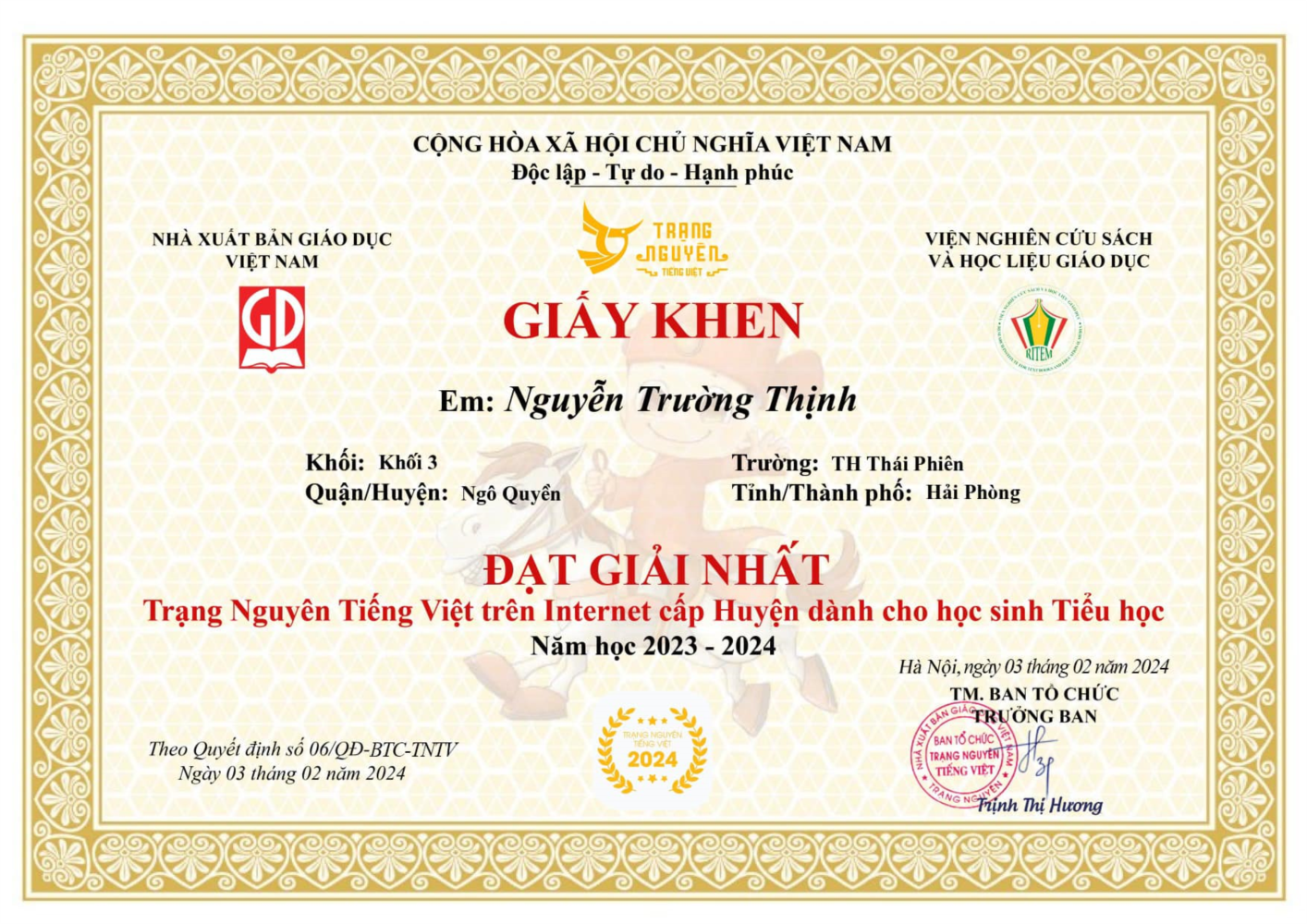 Hiểu được điều này, ngay từ đầu các năm học thầy trò trường Tiểu học Thái Phiên đã tham gia tích cực luyện tập và tham gia cuộc thi. Và kết quả đạt được rất đáng tự hào. Xin chúc mừng các em học sinh trường Tiểu học Thái Phiên đã tham gia tích cực và đạt giải cao trong kì thi Trạng nguyên Tiếng Việt cấp quận năm học 2023 - 2024.