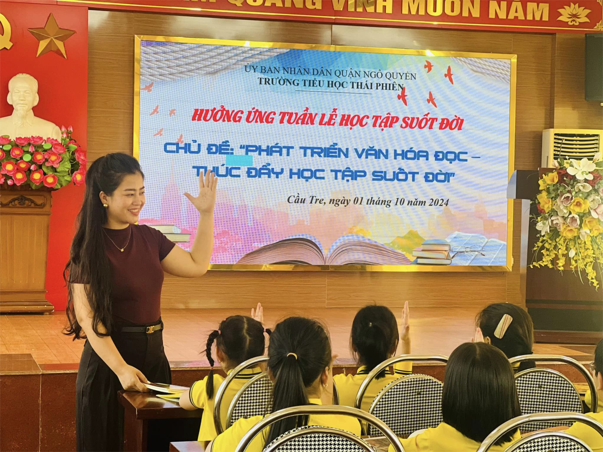 Từ 1/10/2024 trường Tiểu học Thái Phiên phát động Tuần lễ văn hóa đọc. Với chủ đề " Phát triển văn hóa đọc thúc đẩy học tập suốt đời " đến toàn thể cán bộ, giáo viên, nhân viên và học sinh nhà trường với mong muốn mỗi người cần phải rèn luyện kỹ năng đọc, nuôi dưỡng thói quen đọc và hơn thế nữa, biến việc đọc trở thành một niềm đam mê, một nhu cầu thiết yếu trong cuộc sống. Hưởng ứng phong trào đó các thầy cô giáo và các em học sinh đã có những hành động thiết thực như: Quyên góp sách, truyện xây dựng tủ sách dùng chung tại lớp học, tổ chức giờ ra chơi sáng tạo, trao đổi sách với các bạn lớp khác, kể chuyện sách báo, đóng kịch, ...