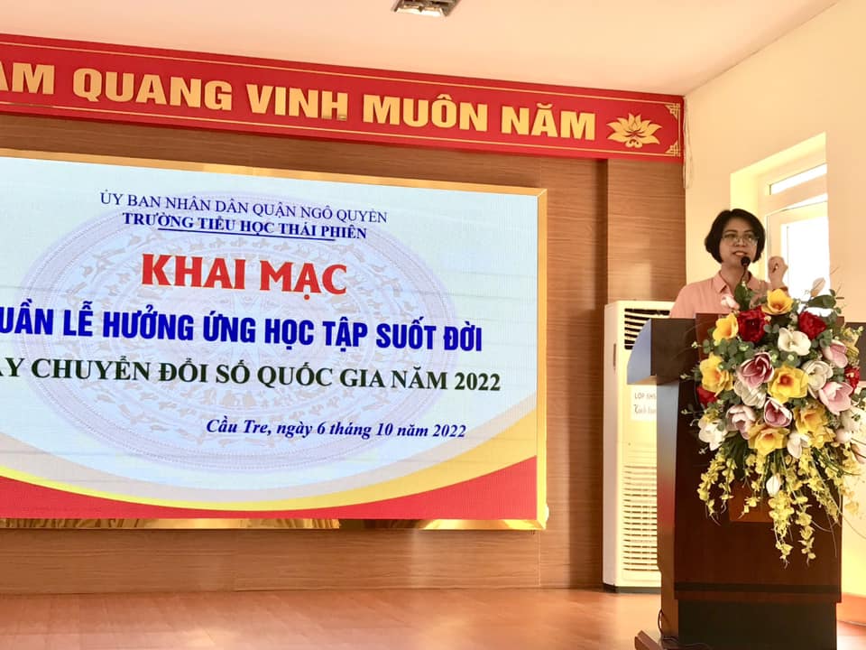 Thực hiện công văn số 4342/BGDĐT-GDTX về việc tổ chức “Tuần lễ hưởng ứng học tập suốt đời năm 2022” của Bộ GĐĐT-GDTX và công văn số 102-CV/ĐTN về việc tổ chức các hoạt động hưởng ứng “Ngày Chuyển đổi số quốc gia năm 2022” của BCH Đoàn quận Ngô Quyền; Tiếp tục triển khai hiệu quả chương trình “ Thiếu nhi Việt Nam - Học tập tốt, rèn luyện chăm”. Hôm nay, ngày 06/10/ 2022 trường Tiểu học Thái Phiên đã tổ chức: Khai mạc “Tuần lễ hưởng ứng học tập suốt đời - Ngày Chuyển đổi số quốc gia năm 2022”